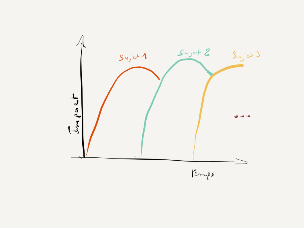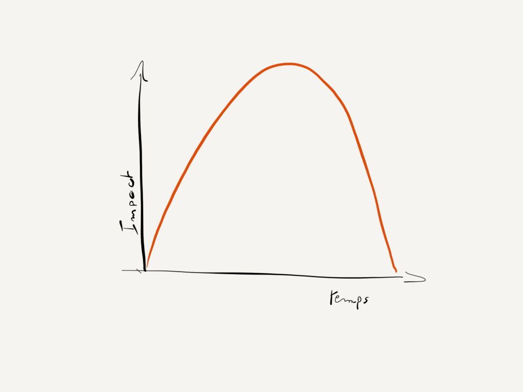 Tout projet a des phases qui supposent de notre part recul et créativité à différents moments, donc sur la durée de vie d’un projet, notre impact pourrait plutôt être comme suit :